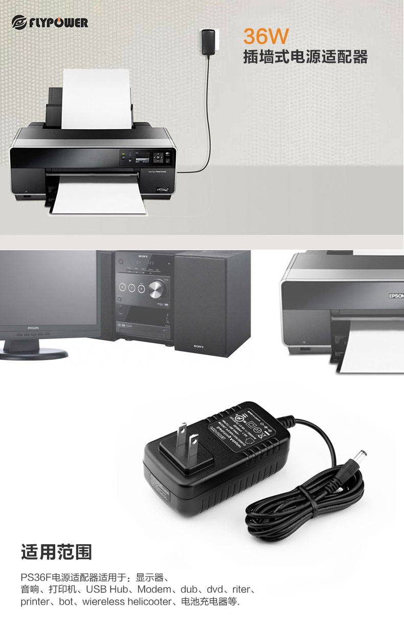 PS36F電源適配器適用于:顯示器、音響、打印機(jī)、USB Hub、Modem、dub、dvd、riter、printer、bot、wiereless helicooter、電池充電器等.